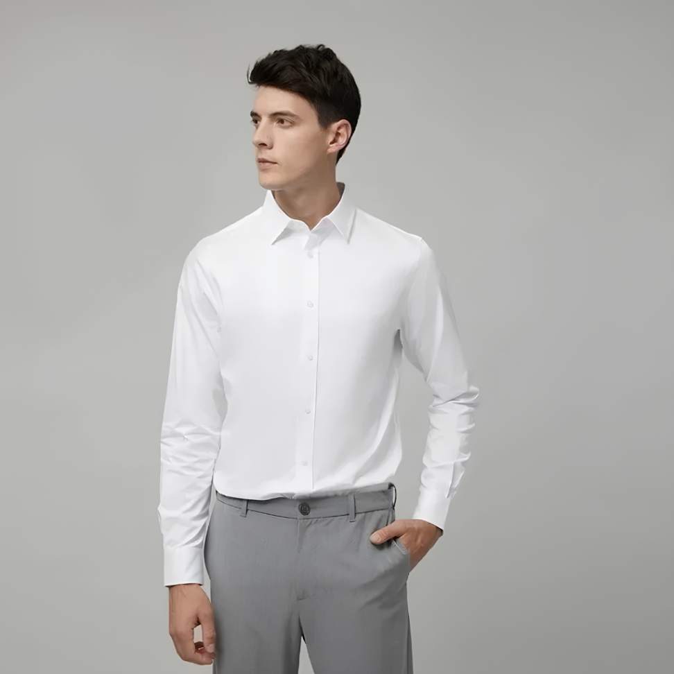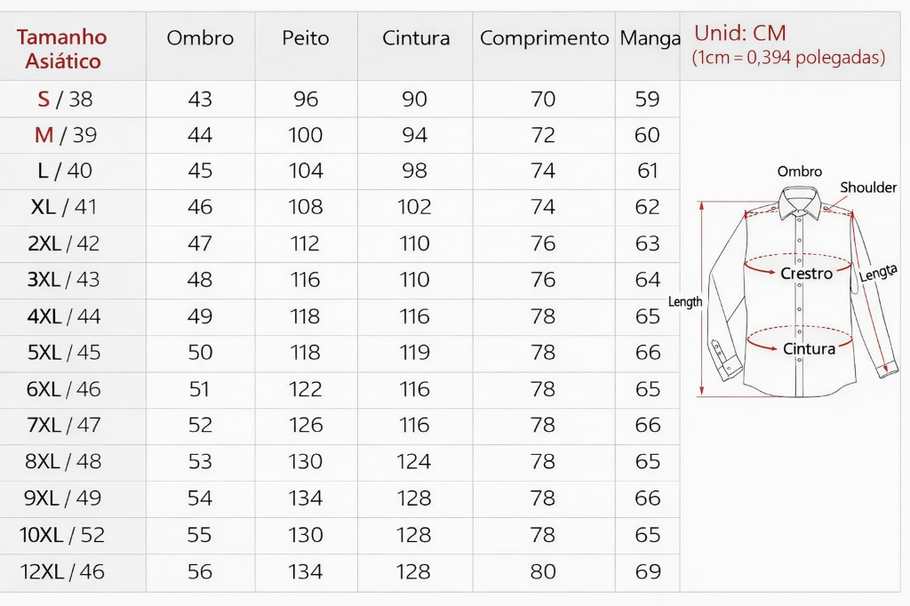 Disponível do S ao 5XL, oferece ajuste proporcional a diferentes tipos de corpo. O caimento slim valoriza a silhueta masculina com naturalidade e leveza.